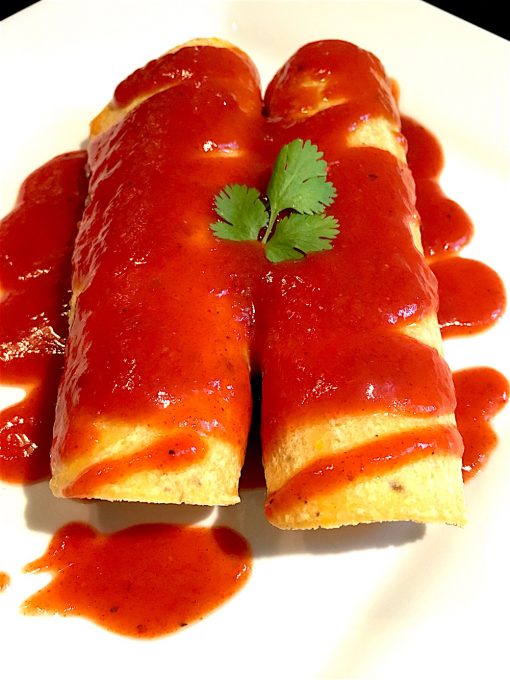 Topped with organic handcrafted enchilada sauce (oil free) and melted vegan cheddar cheeze.