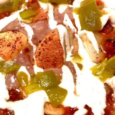 Covered in handcrafted organic enchilada sauce (organic tomatoes, organic red bell pepper, organic lime, organic, non-irradiated spices) and topped with cheddar cheeze.