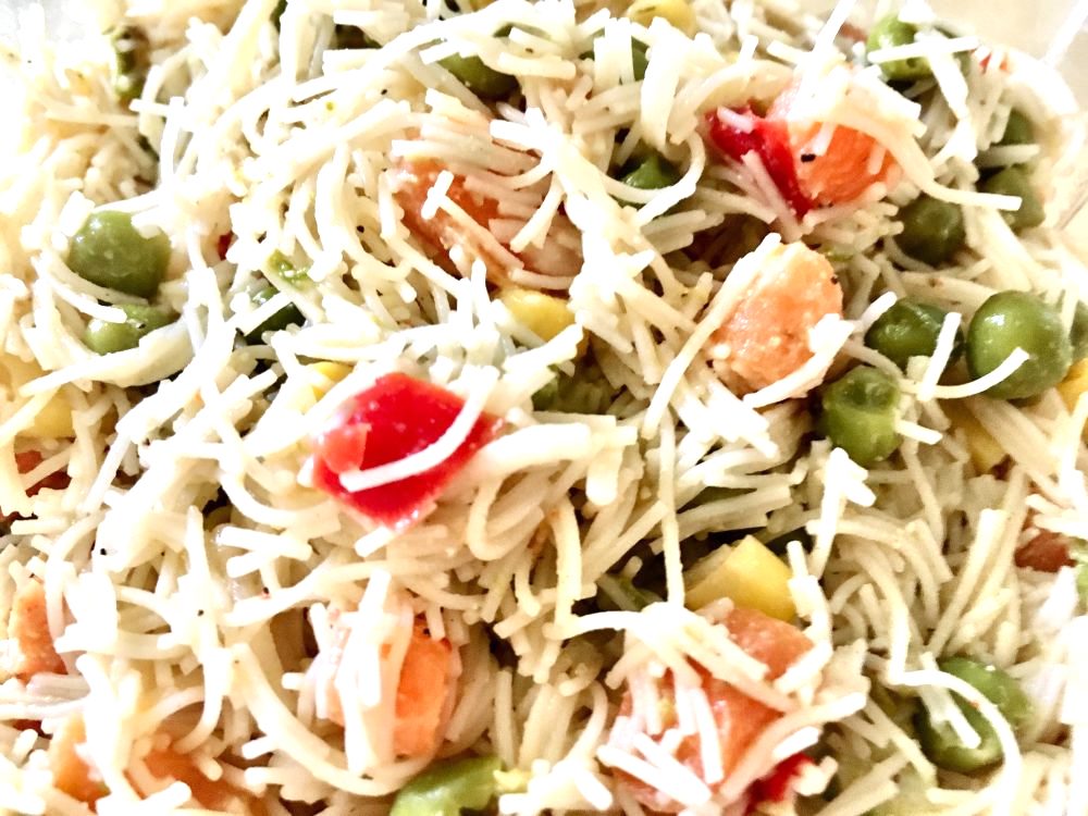 Gluten free brown rice angel hair noodles, organic asparagus, organic peas, organic carrot, organic corn, LOCAL organic red bell pepper and organic, non-irradiated spices.