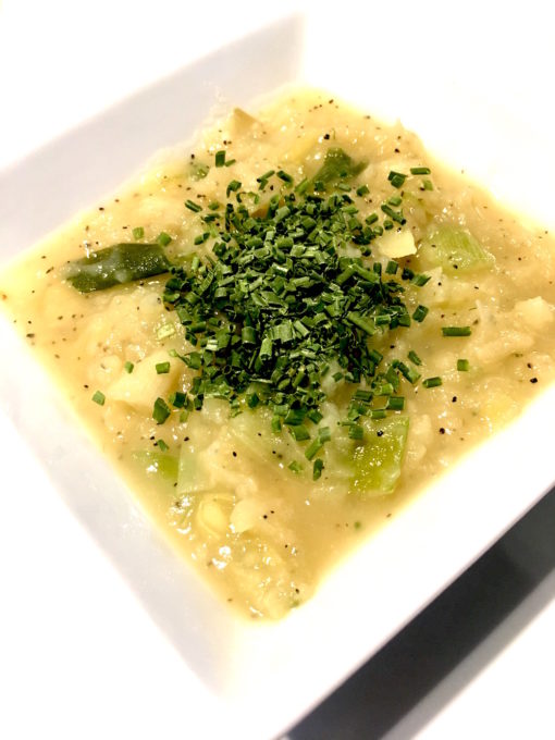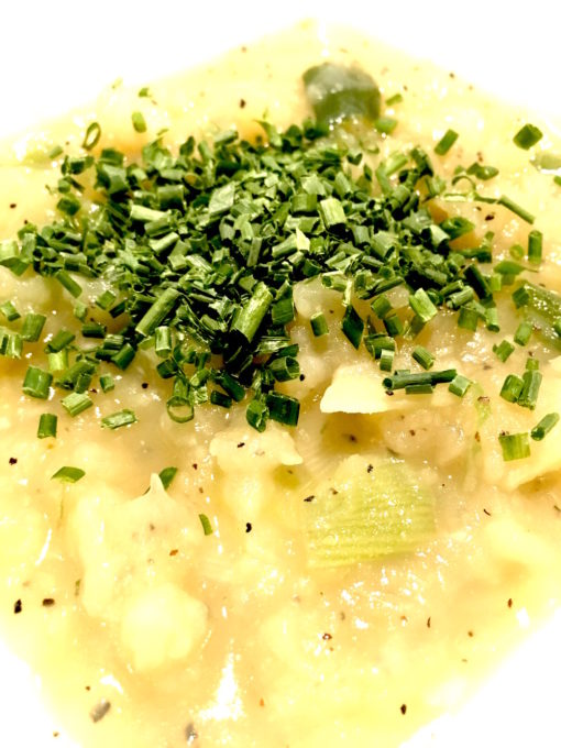 Organic potatoes, organic leeks, organic onion, fresh organic herbs & organic, non-irradiated spices.