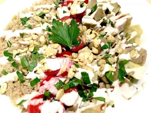 LOCAL organic greens/spring mix, baked organic potato (sweet or russet) fry bites, sprouted organic quinoa, handcrafted raw organic tahini dressing (organic raw tahini, organic lemon and organic, non-irradiated spices), LOCAL tomato and organic fresh herb garnish.