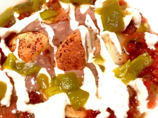 Handcrafted organic refried beans (organic pinto beans, raw pink Himalayan sea salt), oil free roasted organic potatoes, LOCAL organic handcrafted salsa, LOCAL organic sautéed onion & bell peppers, organic mild green chilies and organic, non-irradiated spices.
