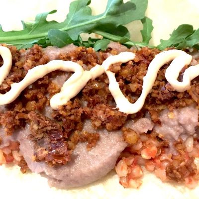 Gluten-free brown rice tortilla, handcrafted organic refried beans (organic pinto beans, raw pink Himalayan sea salt), LOCAL organic bell peppers, LOCAL organic onion and handcrafted organic cashew queso (raw organic cashews, organic mild green chiles, organic lemon, non-synthetic nutritional yeast and organic, non-irradiated spices).