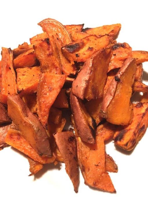 Organic sweet potatoes cut into wedges and roasted with extra virgin olive oil and spices.