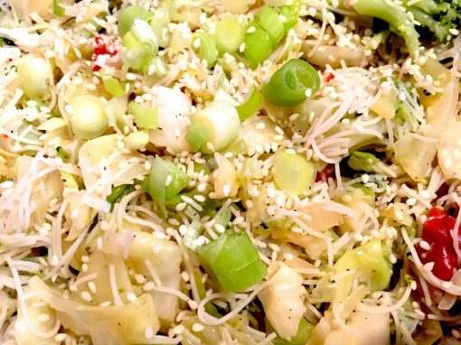 Gluten-free angel hair brown rice noodles tossed in organic cold-pressed toasted sesame oil and mixed with organic broccoli, LOCAL organic zucchini, organic cabbage, LOCAL organic onion, LOCAL organic red bell pepper and organic, non-irradiated spices.