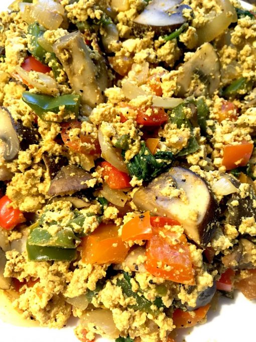 Organic non-GMO tofu, LOCAL organic red bell pepper, LOCAL organic green bell pepper, organic mushroom, LOCAL organic onion, non-GMO/non-synthetic nutritional yeast, Bragg’s liquid aminos and organic, non-irradiated spices.
