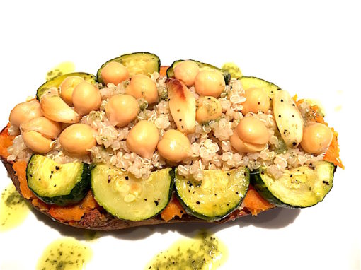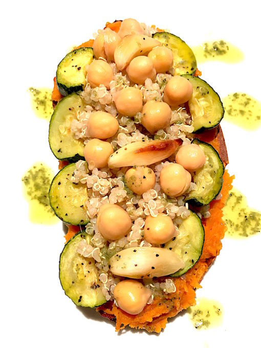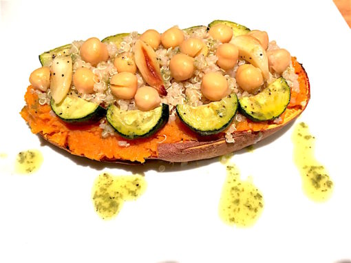 LOCAL organic sweet potato stuffed with sprouted organic quinoa, organic garbanzo beans, LOCAL organic zucchini, LOCAL organic onion LOCAL organic bell peppers and roasted organic garlic cloves.
