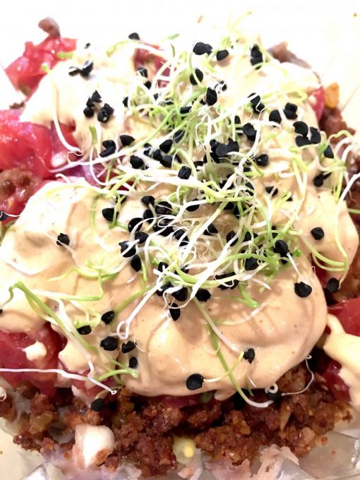 Topped with a handcrafted organic raw cashew queso cheeze sauce and garnished with LOCAL organic scallions.