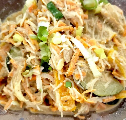 Organic zucchini noodles, gluten free angel hair brown rice noodles, organic carrot, organic bell peppers, organic onion and organic, non-irradiated spices.
