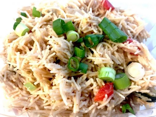 Gluten free angel hair brown rice noodles, organic zucchini, LOCAL organic red bell pepper, LOCAL organic onion and organic, non-irradiated spices.