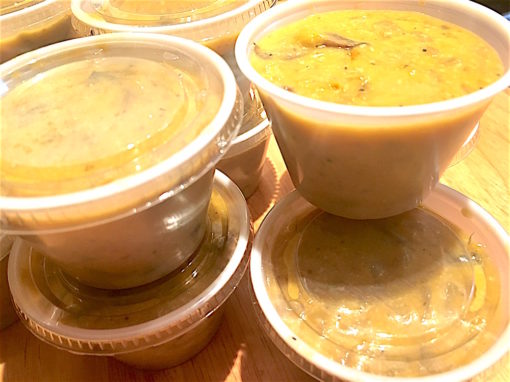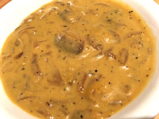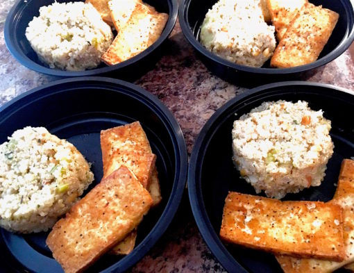 Organic, non-gmo tofu steaks seasoned with organic, non-irradiated spices and pan-fried to perfection in cold-pressed avocado oil with 4 oz cup of freshly handcrafted mushroom gravy (organic vegetable stock, non-GMO/non-synthetic nutritional yeast, organic mushrooms, organic onions and arrowroot).